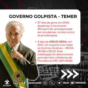 Reivindicações: Contra os ataques do governo Temer aos trabalhadores, em especial contra a Reforma Trabalhista, a Reforma da Previdência e a legalização da terceirização ampla e irrestrita.