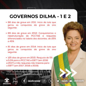 Encampamos em nossos movimentos paredistas bandeiras históricas, como as lutas por valorização profissional; contra os Planos Bresser, Verão e Collor; em defesa da Previdência Pública; pela manutenção do Regime Jurídico Único; em favor da contratação de novos servidores e contra as políticas de precarização e sucateamento da Rede Federal.
