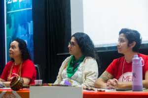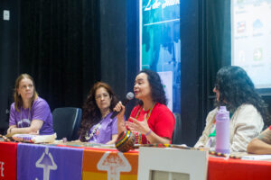 Na tarde do segundo dia (4), a mesa “Corpos Exaustos e Resistências: Condições de Trabalho, Saúde Mental e Políticas do Cuidado”, contou com a participação de Lissa Fontenele, representando o SINASEFE, e Raquel Nepomuceno, representando o SINDSIFCE, além das convidadas Grazielle Felício, Daniela Botti e Isabelle Alves, com mediação de Milena Silva.