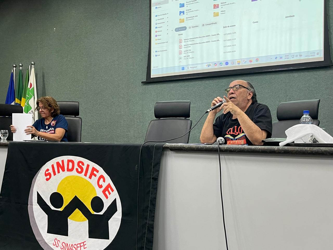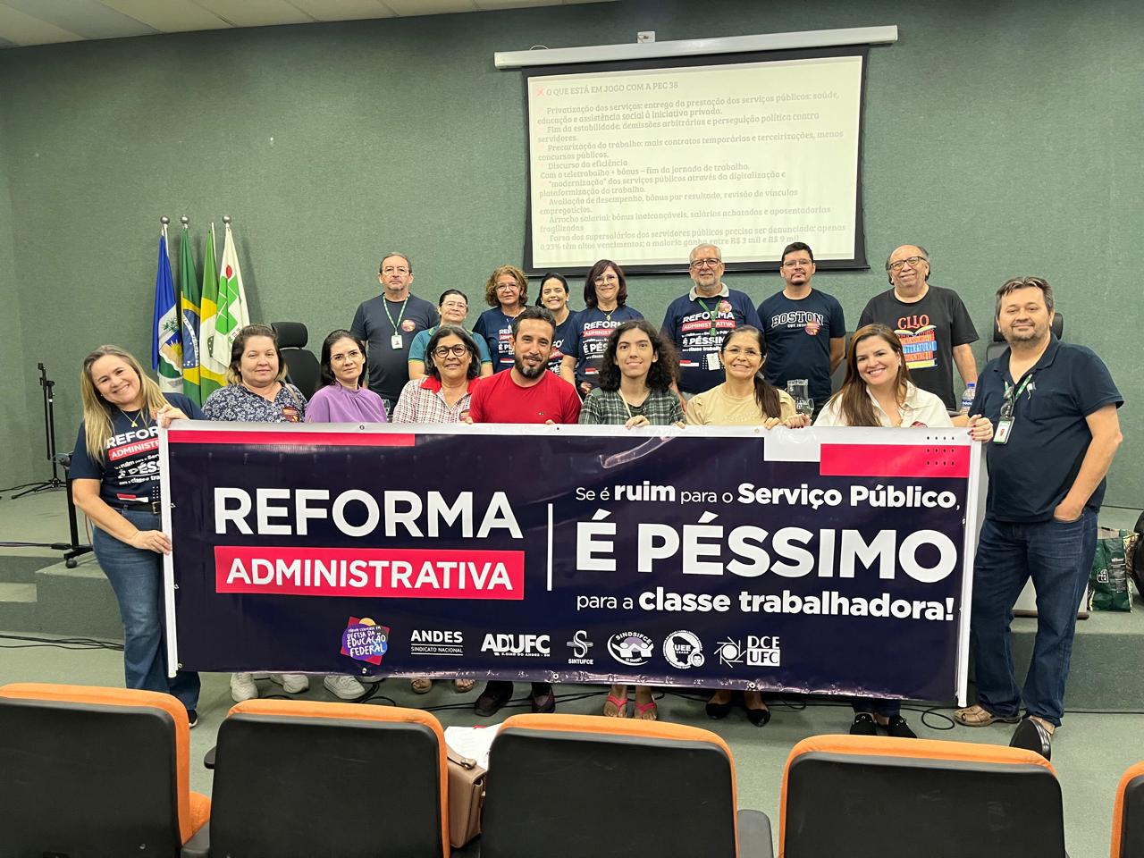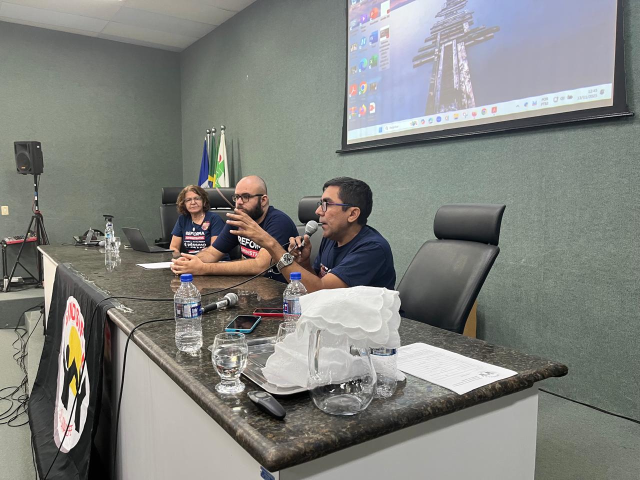 Para falar sobre a Reforma Administrativa, estiveram presentes Eudes Baima e Maria do Céu, do ANDES-SN. Os professores trouxeram uma análise histórica sobre o tema e alertaram sobre os perigos da proposta para a população brasileira e especialmente para os(as) servidores(as).