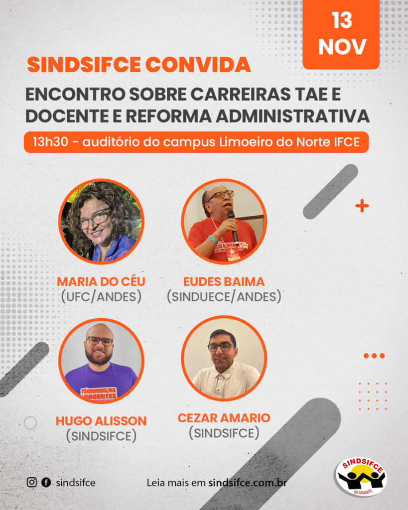 O SINDSIFCE realiza, nesta quinta-feira (13), um encontro presencial no Campus Limoeiro do Norte aberto ao público sobre Reforma Administrativa e as carreiras TAE e docente. O encontro acontece a partir das 13h30 no auditório do campus, e tem por objetivo informar e ampliar o debate sobre temas pertinentes aos servidores, empoderando os servidores dos direitos e ameaças às suas carreiras.